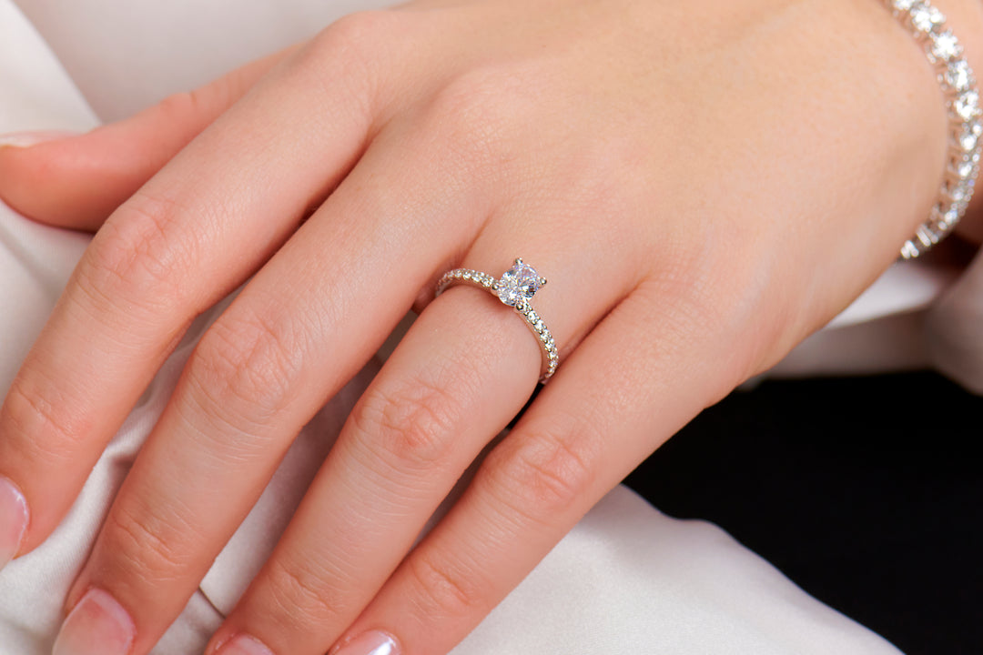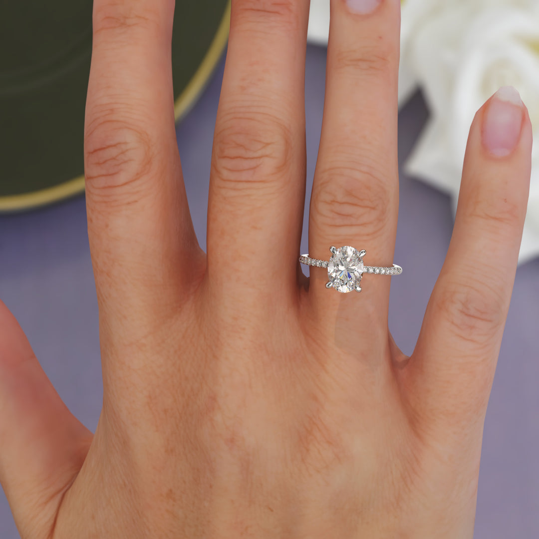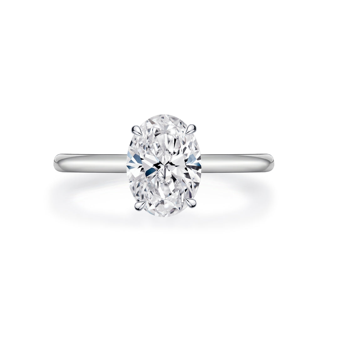 In oval diamond engagement rings, both colour and clarity are significant, but they influence the diamond's appearance differently. The oval shape can reveal colour more prominently, so choosing a grade closer to colourless is vital for a bright, brilliant look. Explore our diamond options to find the perfect hue for your ring. While colour often takes priority, clarity is also crucial as oval cuts may highlight inclusions. A higher clarity grade can enhance brilliance and preserve a flawless appearance. Balancing both elements ensures optimal visual appeal. Visit our diamond education page for expert advice on selecting the right diamond to match your preferences and budget.