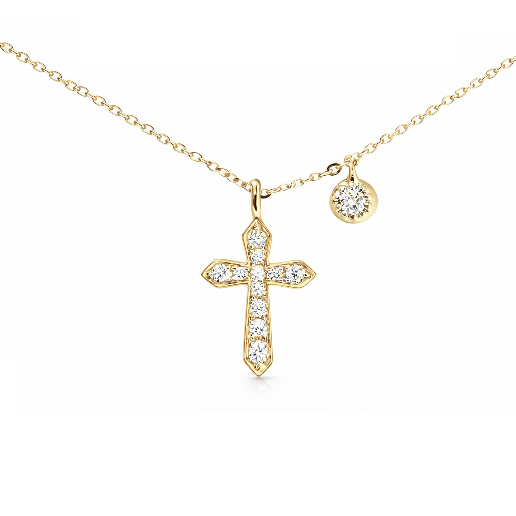 Round brilliant cut diamond fancy cross pendant on a fixed 18ct white or yellow gold chain with feature diamond.