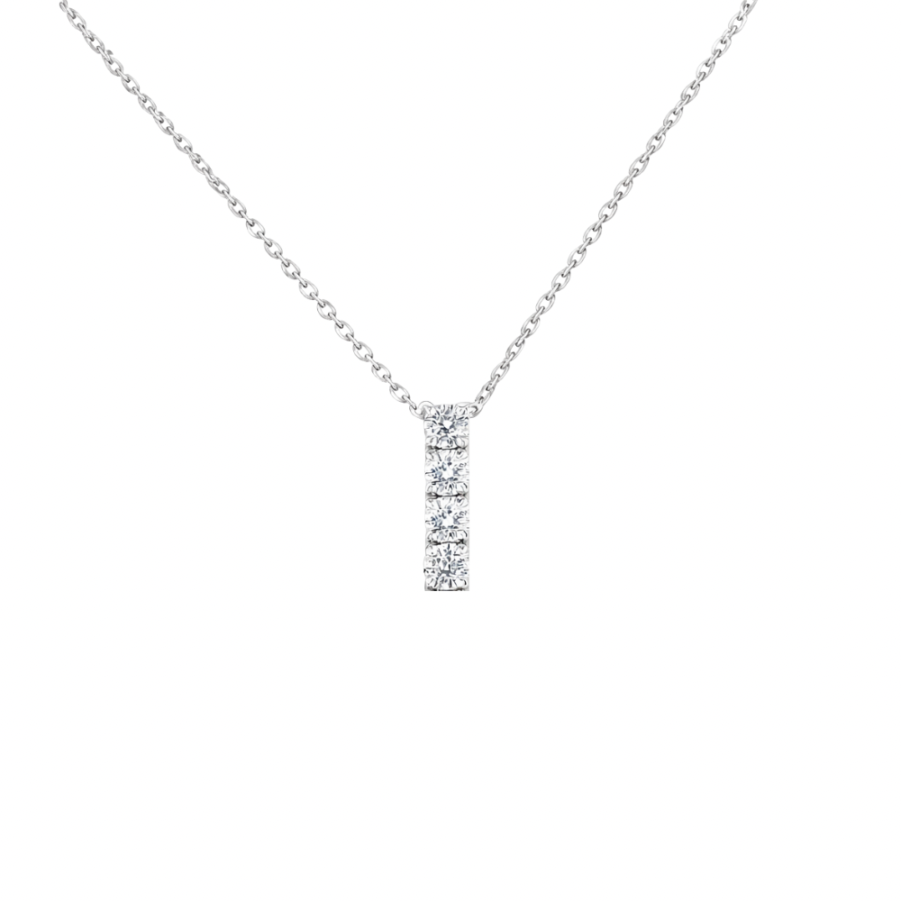 Four round brilliant cut diamonds claw set in a drop pendant design with bunny ears on a 45cm fixed white gold chain.