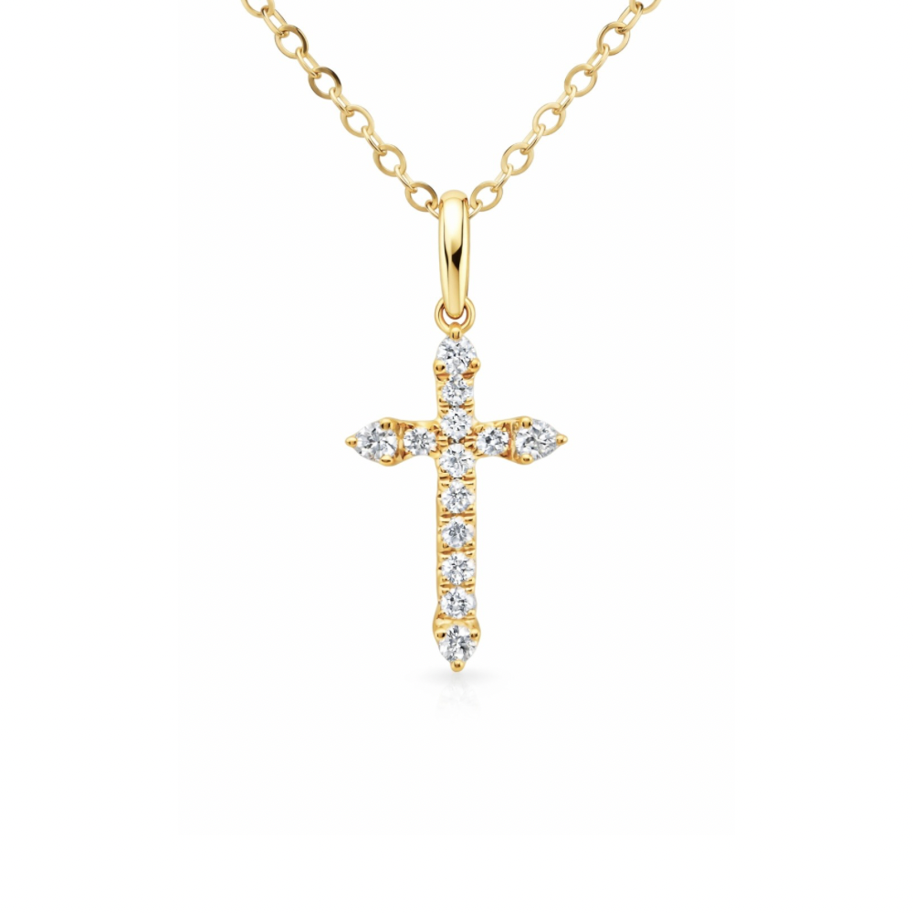 Round brilliant cut diamond cross pendant on a plain bail. Please note the 18ct yellow gold chain is included.