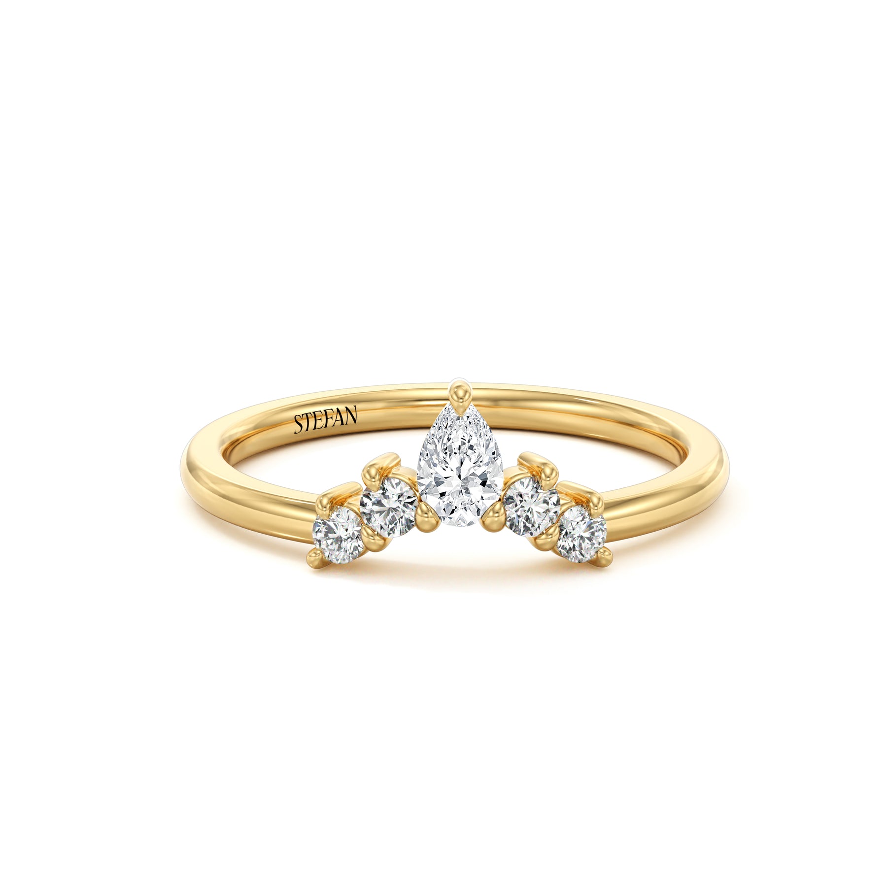 - 18ct gold tiara ring featuring a central pear-shaped diamond set in three claws, with two round brilliant cut diamonds claw set on either side, totalling approximately 0.32ct